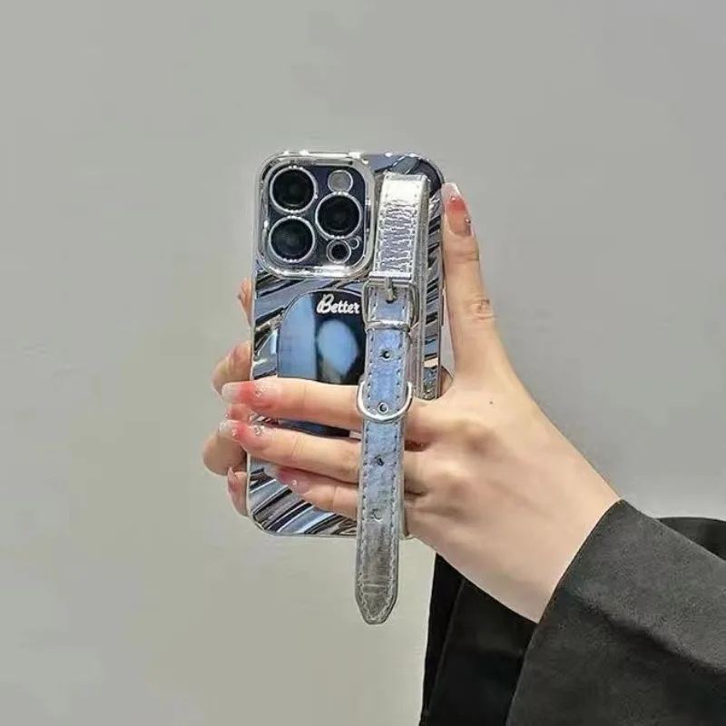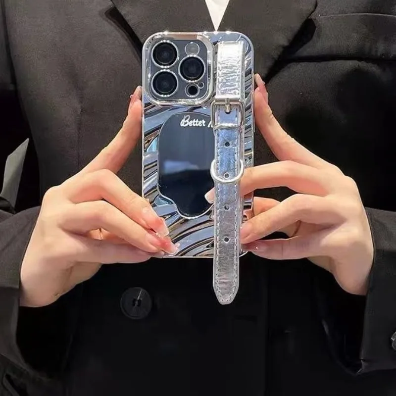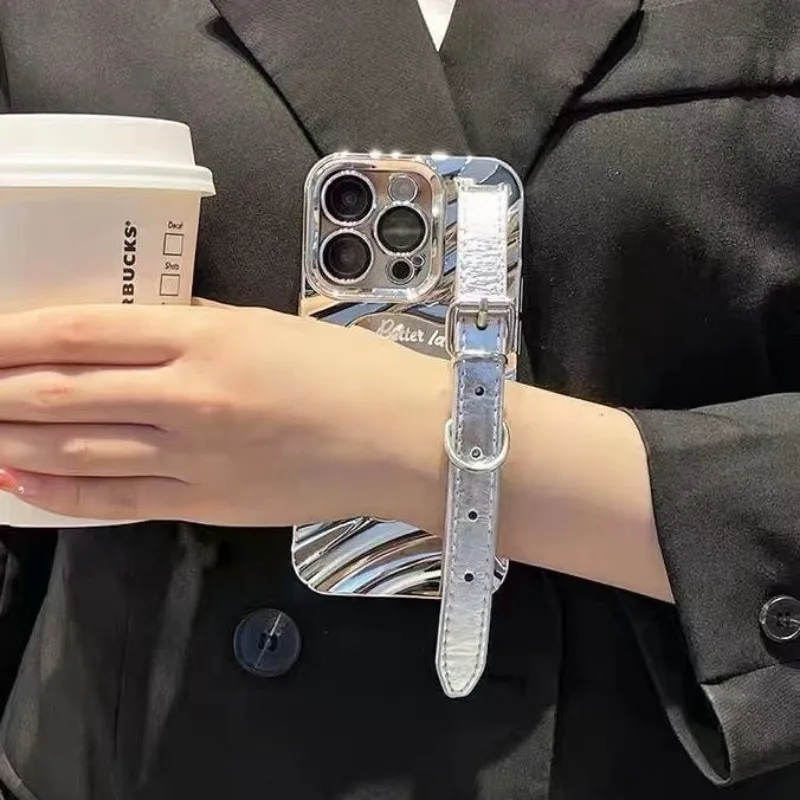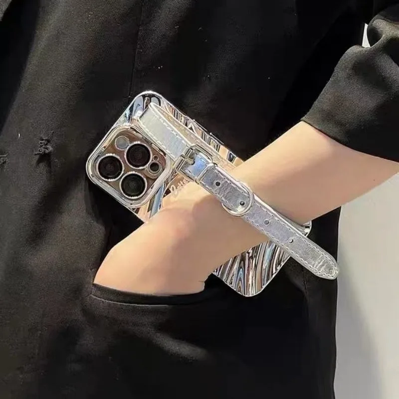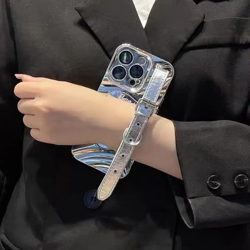 INS Korean Y2k Punk Cool Silver Belt Wristband Phone Case or iPhone 15 Pro Max 11 12 13 14 15 16 Pro Mirror Shockproof Cover