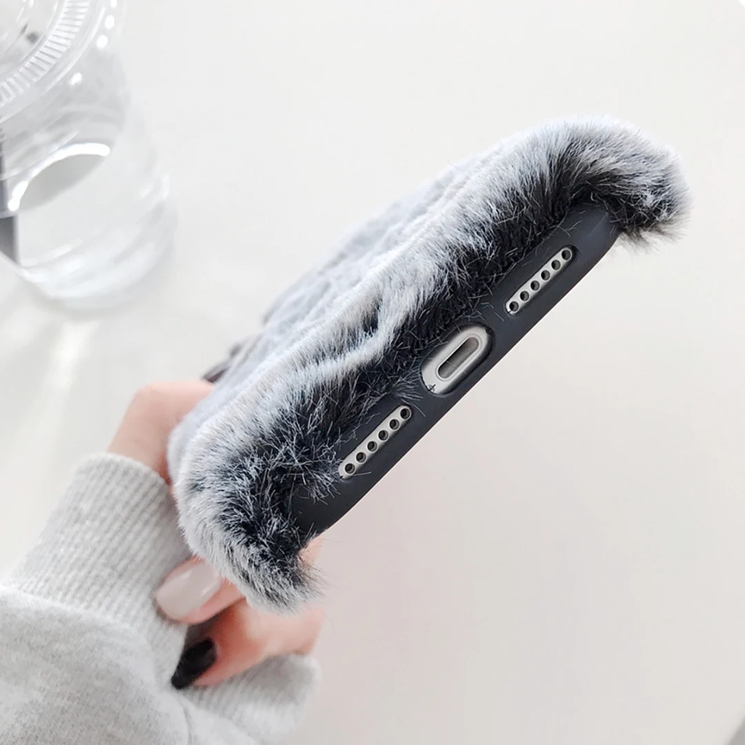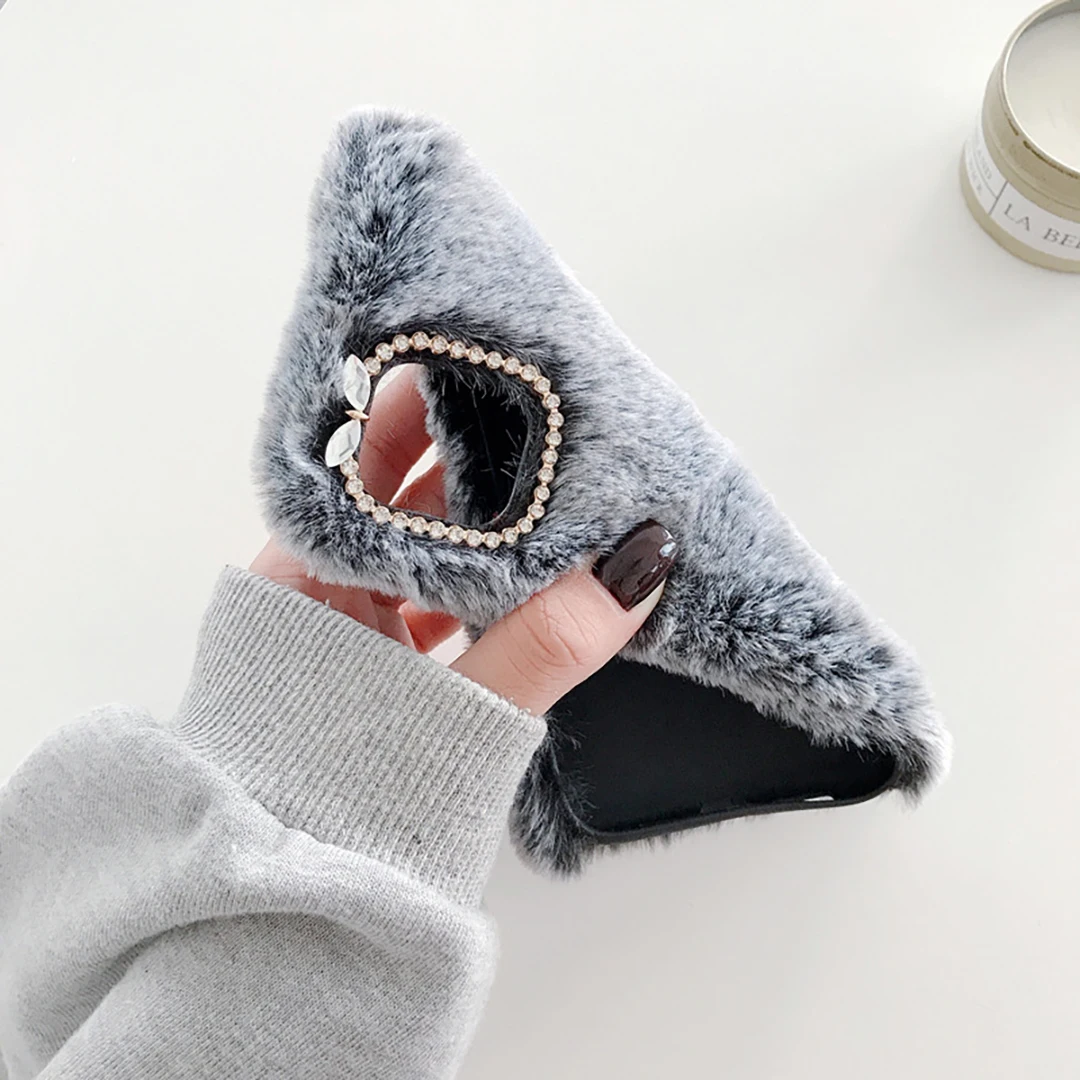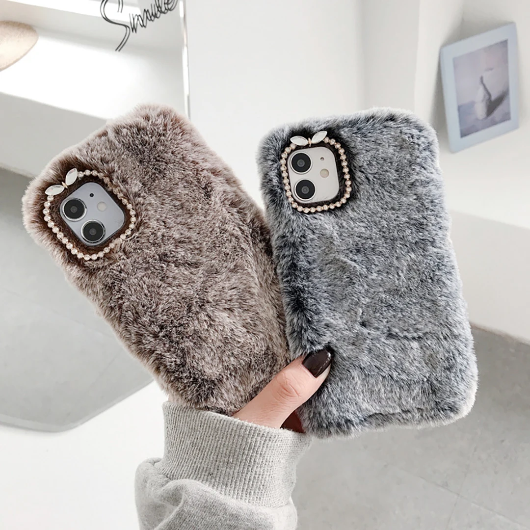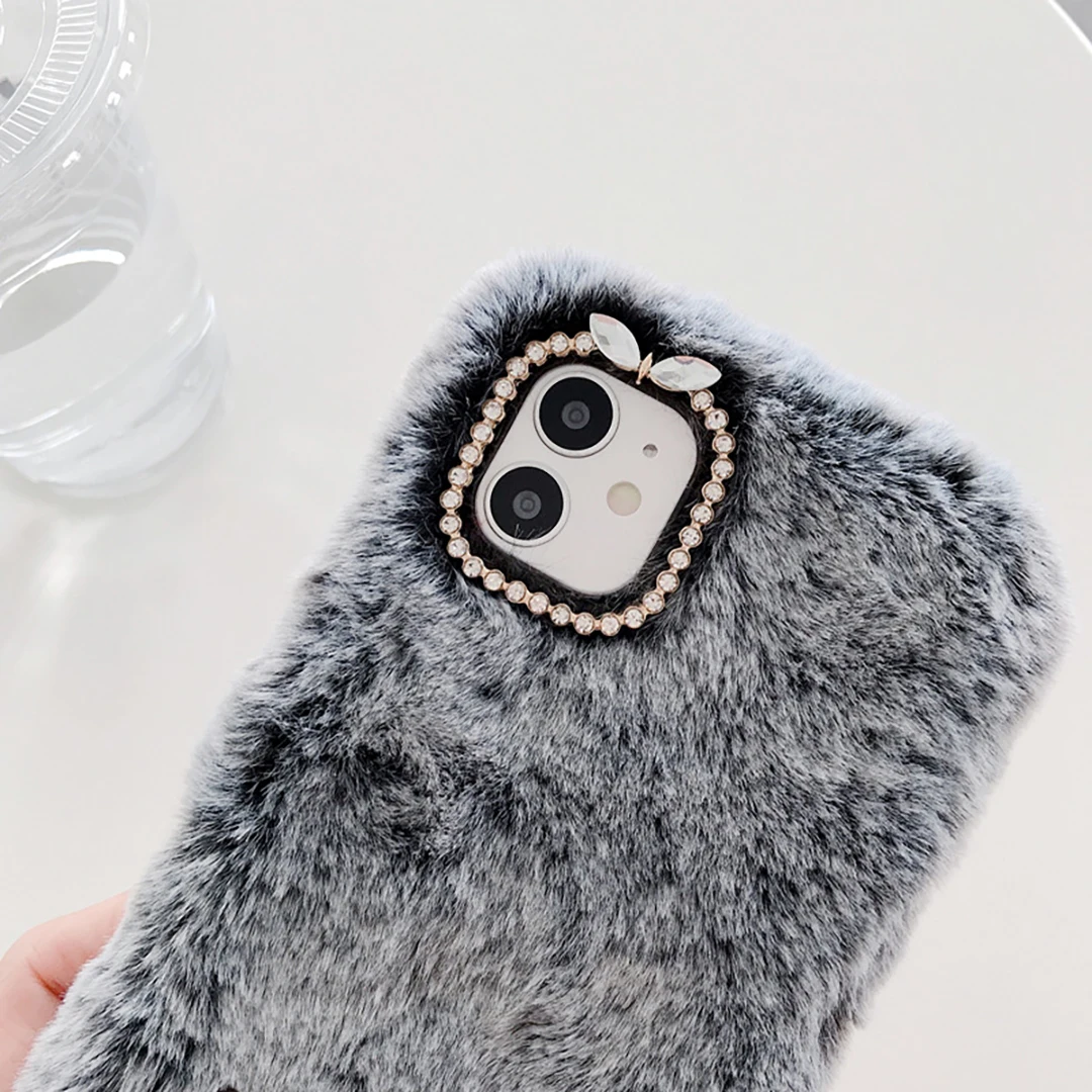 Fur Plush Phone Case for iPhone 14 13 12 11 Pro Max XS Max XR X SE 2020 6S 7 8 Plus Luxury Diamond Glitter Warm Furry Soft Cover